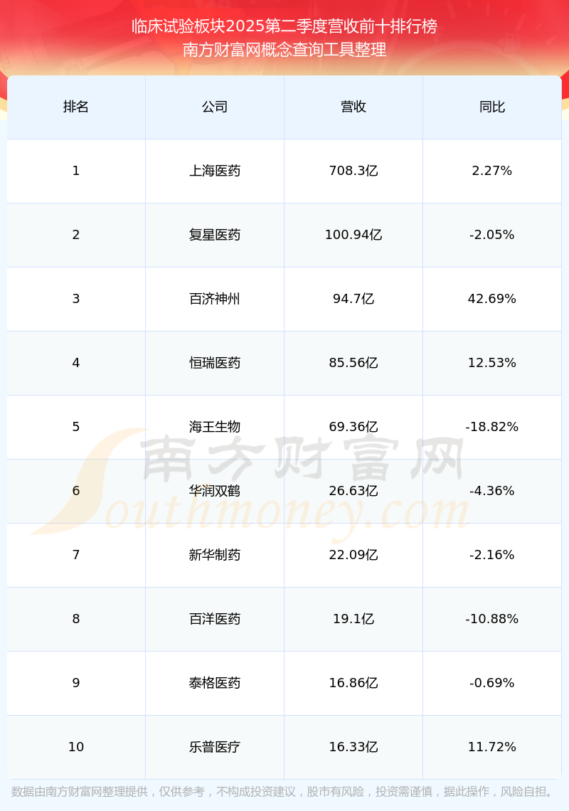 按照开云手机web版登录入口概念查询工具统计,该股所属板块为临床试验板块,该板块共有57只股票,百花医药2025第二季度营收在该板块中排名为第50名,该板块2025第二季度营收排名前十的股票如下表: