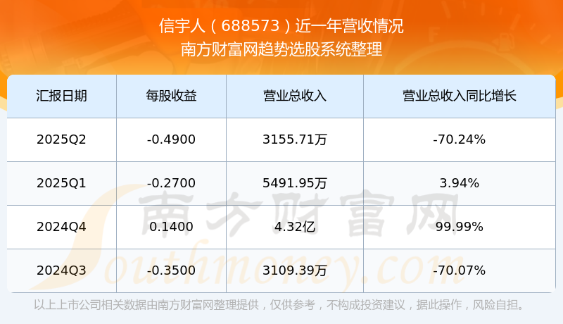 信宇人2025年第二季度显示,公司主营收入3155.71万元,同比-70.24%;归母净利润-4654.11万元,同比-236.13%;扣非净利润-4711.37万元,同比-224.74%。
