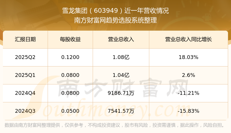 雪龙集团(603949)发布2025年第二季度财报。2025年第二季度雪龙集团实现营业收入1.08亿元,同比增加18.03元%,环比增加4.6%;净利润为2350.24万元,同比增长69.74%,环比增长32.23%。