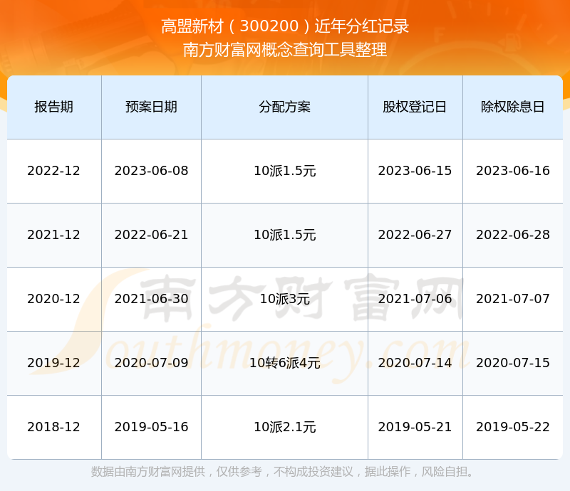 高盟新材最新一次公布的分红方案为10派1.5元。本次权益分派股权登记日为2023年6月15日,除权除息日为2023年6月16日,派息日为2023年6月16日。