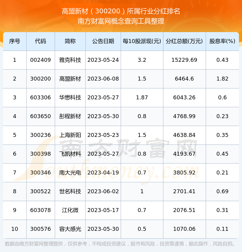 按照开云手机web版登录入口趋势选股系统统计,高盟新材所属行业为化学制品行业,化学制品行业分红排名情况如下表: