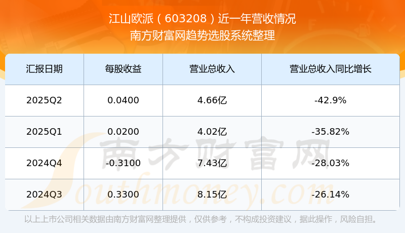 江山欧派(603208)发布2025年第二季度财报。2025年第二季度江山欧派实现营业收入4.66亿元,同比增加-42.9元%,环比增加15.83%;净利润为662.67万元,同比增长-91.3%,环比增长91.48%。