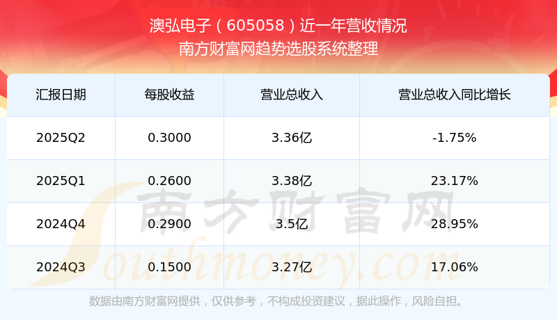 澳弘电子2025年第二季度显示,公司主营收入3.36亿元,同比-1.75%;归母净利润4412.81万元,同比-6.19%;扣非净利润4337.61万元,同比40.51%;