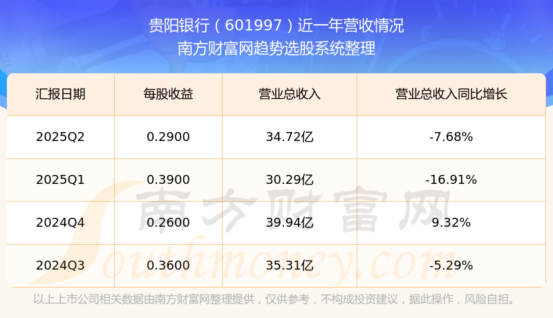 贵阳银行2025年第二季度公司实现营业收入34.72亿元,同比-7.68%;归母净利润10.31亿元,同比-7.72%。