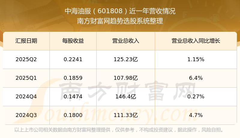 中海油服披露了2025年第二季度财报。报告显示,中海油服2025年第二季度实现营收125.23亿元,同比1.15%;归母净利润10.77亿元,同比12.52%。