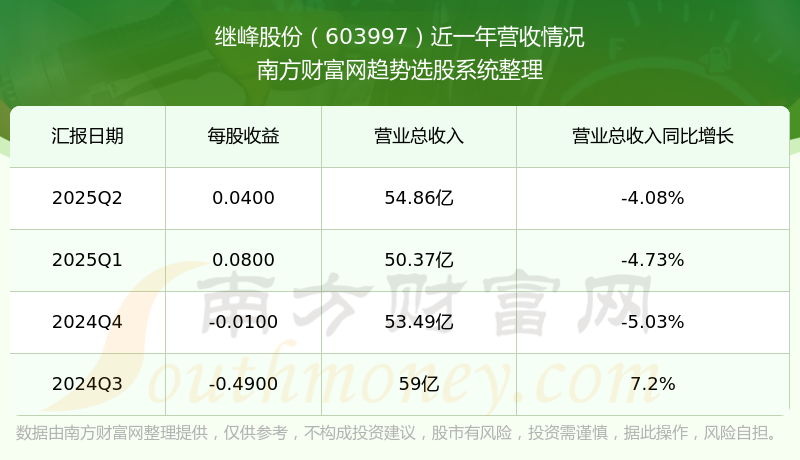 继峰股份(603997)披露2025年第二季度报告,报告期实现营收54.86亿元,同比-4.08%;归母净利润4942.2万元,同比45.06%;扣非净利润1亿元,同比808.46%;基本每股收益0.04元。