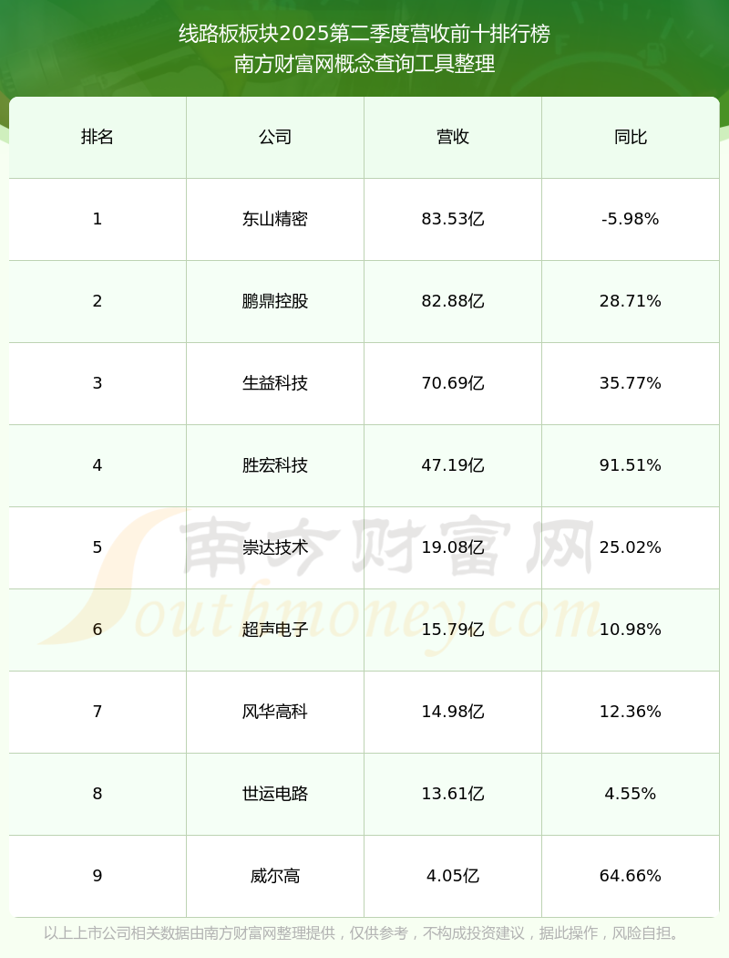 按照开云手机web版登录入口概念查询工具统计,该股所属板块为线路板板块,该板块共有9只股票,世运电路2025第二季度营收在该板块中排名为第8名,该板块2025第二季度营收排名前十的股票如下表: