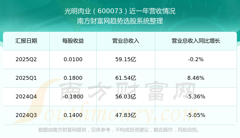 光明肉业2025年第二季度显示,公司主营收入59.15亿元,同比-0.2%;归母净利润1034.8万元,同比-93.28%;扣非净利润585.14万元,同比-92.47%;