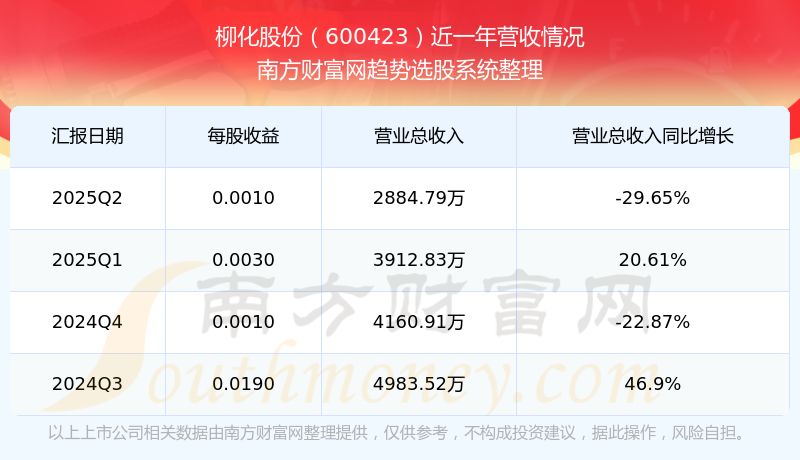 柳化股份2025年第二季度财报显示,公司主营收入2884.79万元,同比-29.65%;归母净利润126.12万元,同比-90.38%;扣非净利润102.11万元,同比-91.94%;