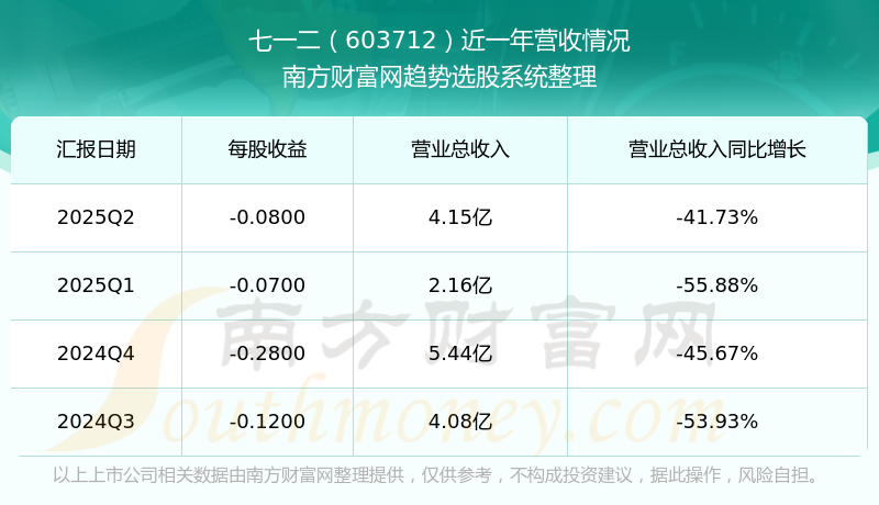 财报显示,2025年第二季度七一二营收4.15亿元,同比增长-41.73%,净利润-6021.8万元,同比增长-217.94%。