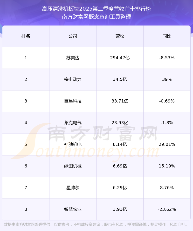 按照开云手机web版登录入口概念查询工具统计,该股所属板块为高压清洗机板块,该板块共有8只股票,绿田机械2025第二季度营收在该板块中排名为第6名,该板块2025第二季度营收排名前十的股票如下表: