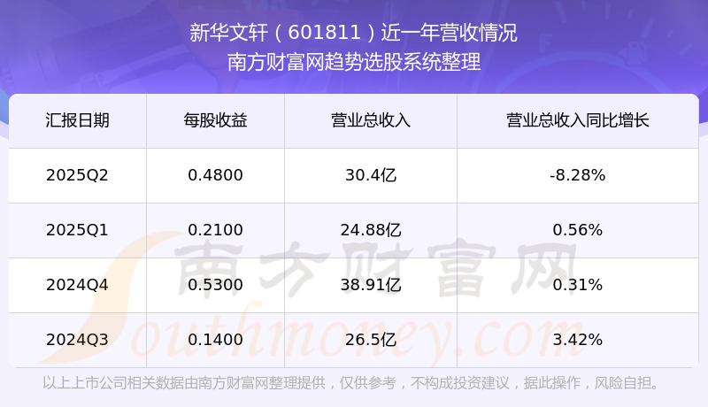 新华文轩2025年第二季度财报显示,公司主营收入30.4亿元,同比-8.28%;归母净利润5.97亿元,同比17.11%;扣非净利润6.01亿元,同比15.38%。