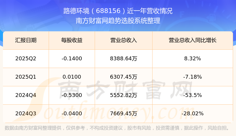 路德环境(688156)披露2025年第二季度报告,报告期实现营收8388.64万元,同比8.32%;归母净利润-1432.82万元,同比-243.65%;扣非净利润-1502万元,同比-211.38%。