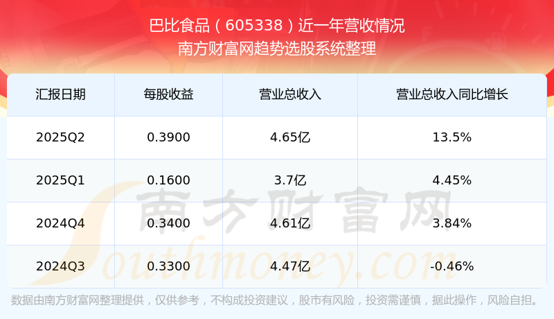 巴比食品2025年第二季度显示,公司主营收入4.65亿元,同比13.5%;归母净利润9445.53万元,同比31.42%;扣非净利润6230.57万元,同比24.28%。