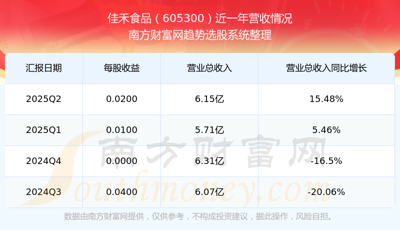 佳禾食品披露了2025年第二季度财报。报告显示,佳禾食品2025年第二季度实现营收6.15亿元,同比15.48%;归母净利润852.64万元,同比-64.06%。