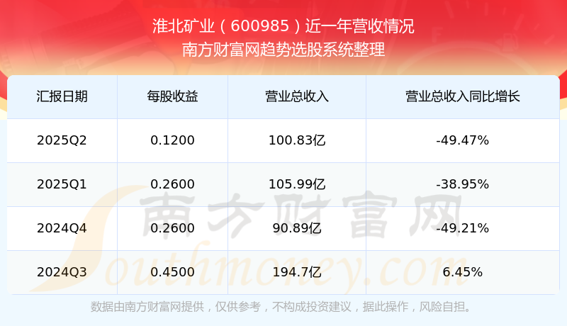 在2025年第二季度,淮北矿业的业绩表现,主营业务收入达到100.83亿元,实现了-49.47%的同比增长率。同时,公司归母净利润录得3.4亿元,同比增长-74.72%。