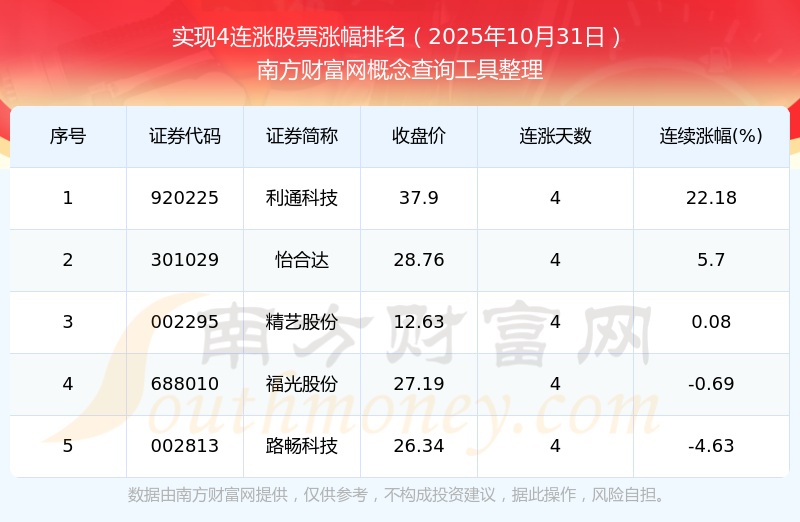 根据开云手机web版登录入口概念查询工具数据统计,截止2025年10月31日收盘,共有5只个股实现4天连涨。其中连续涨幅较大的个股有利通科技、怡合达、精艺股份等,连续涨幅分别为22.18%、5.70%、0.08%。