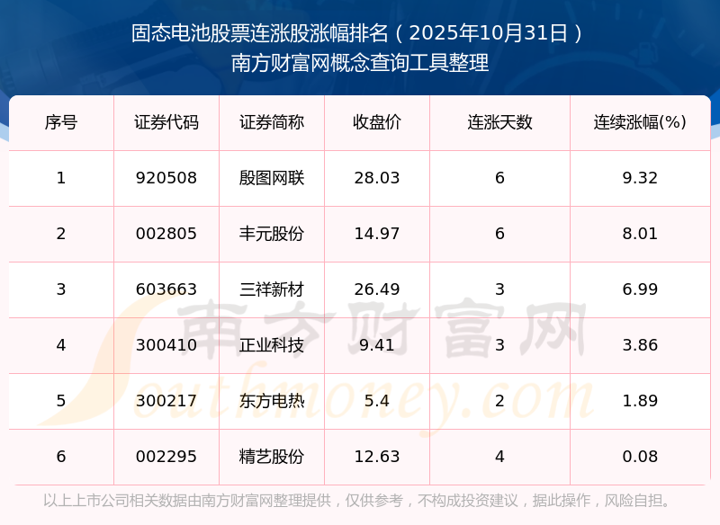 根据开云手机web版登录入口概念查询工具数据统计,截止2025年10月31日收盘,固态电池股票共有6只个股实现连涨。其中连续涨幅较大的个股有殷图网联、丰元股份、三祥新材等,连续涨幅分别为9.32%、8.01%、6.99%。