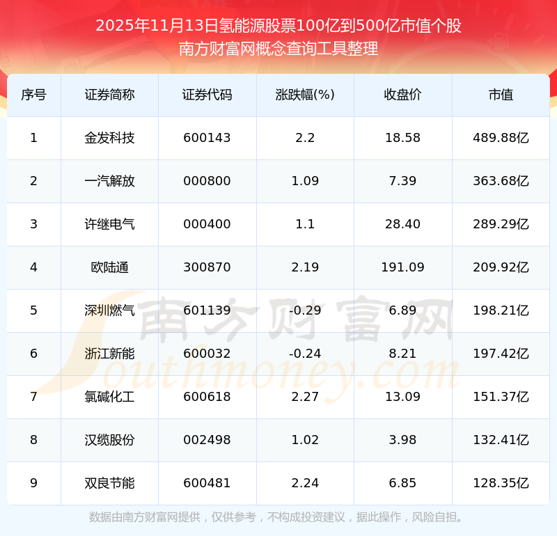截止2025年11月13日,氢能源股票市值100亿到500亿的个股共有9只。其中,市值较高的有金发科技、一汽解放、许继电气,市值分别为489.88亿元、363.68亿元、289.29亿元。