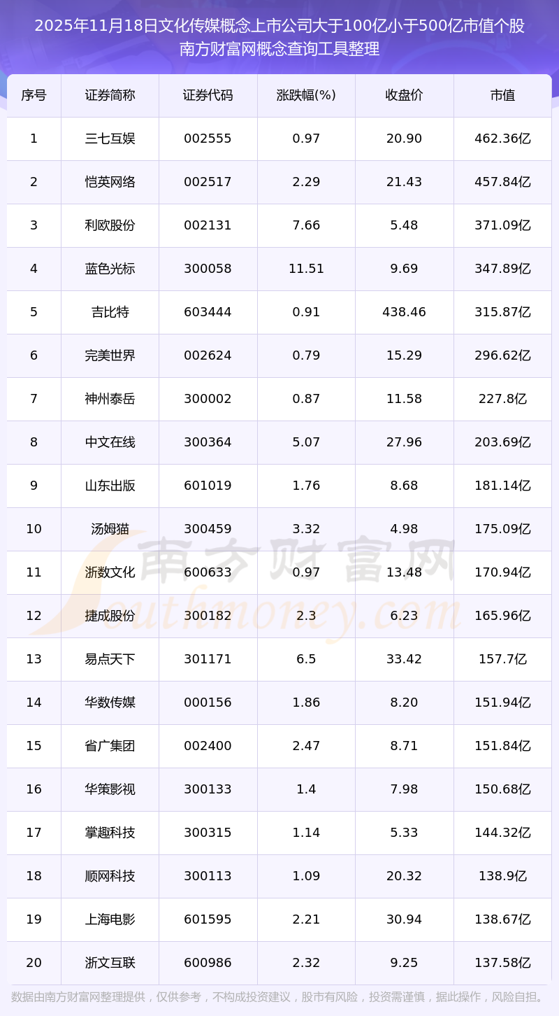 截止2025年11月18日,文化传媒概念上市公司市值大于100亿小于500亿的个股共有28只。其中,市值较高的有三七互娱、恺英网络、利欧股份,市值分别为462.36亿元、457.84亿元、371.09亿元。