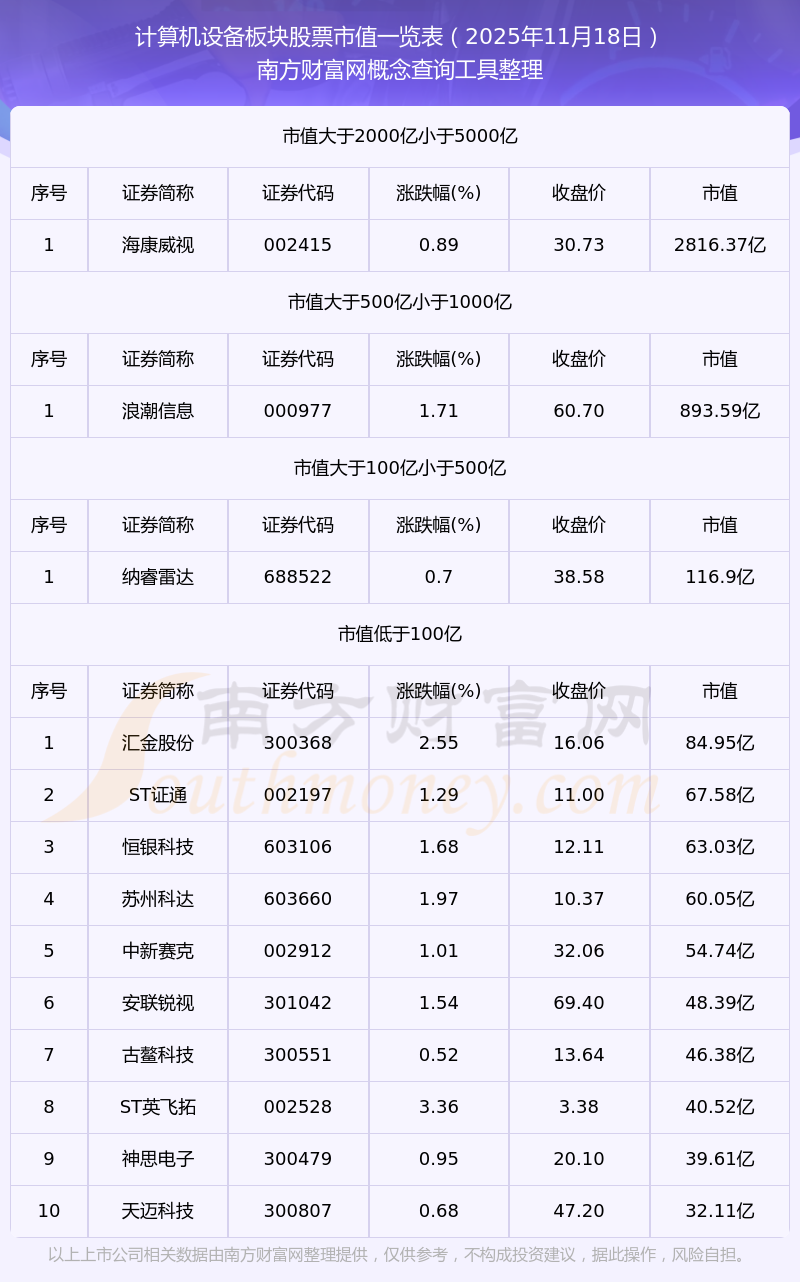 截止2025年11月18日,计算机设备板块股票中恒为科技、汇金股份、卡莱特、盛视科技等47家市值位于不足100亿之列;淳中科技、广电运通、同方股份、纳思达、道通科技等12家市值位于100亿到500亿之列;浪潮信息、大华股份、中国长城等3家市值位于500亿到1000亿之列;中科曙光市值位于1000亿到2000亿之列;海康威视市值位于2000亿到5000亿之列。