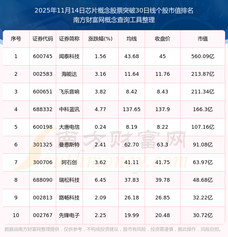 2025年11月14日芯片概念股票突破30日线个股市值排名