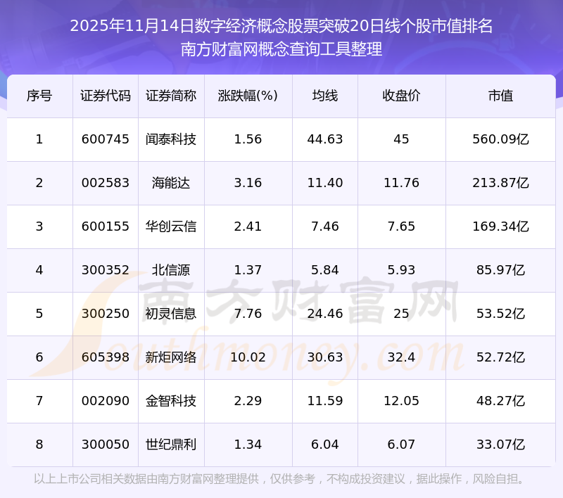 2025年11月14日数字经济概念股票突破20日线个股市值排名