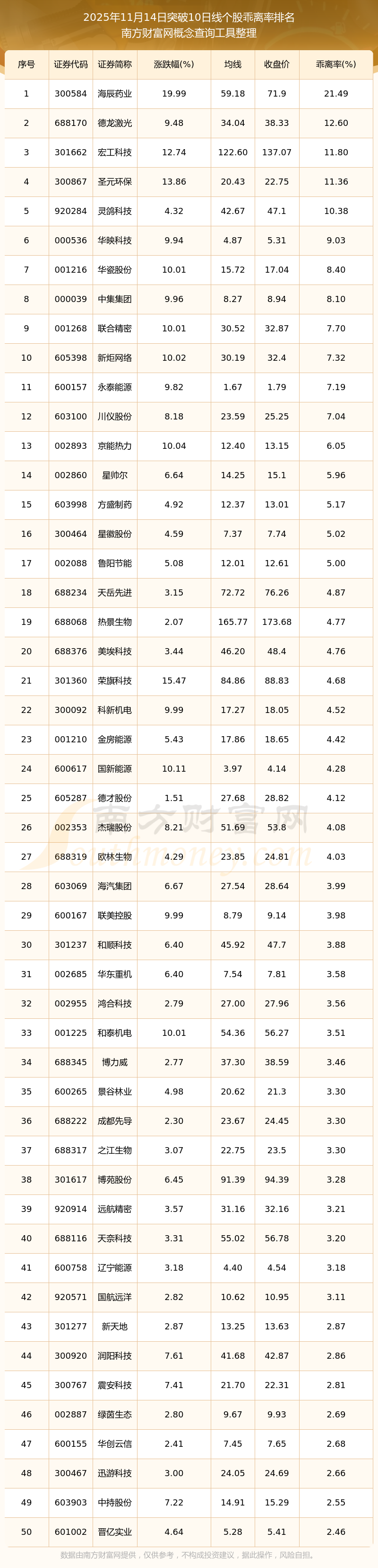 根据开云手机web版登录入口概念查询工具数据统计,截止2025年11月14日收盘,共有132只个股收盘价向上突破了10日线,其中乖离率较大的个股有海辰药业、德龙激光、宏工科技、圣元环保、灵鸽科技等,乖离率分别为21.49%、12.60%、11.80%、11.36%、10.38%。