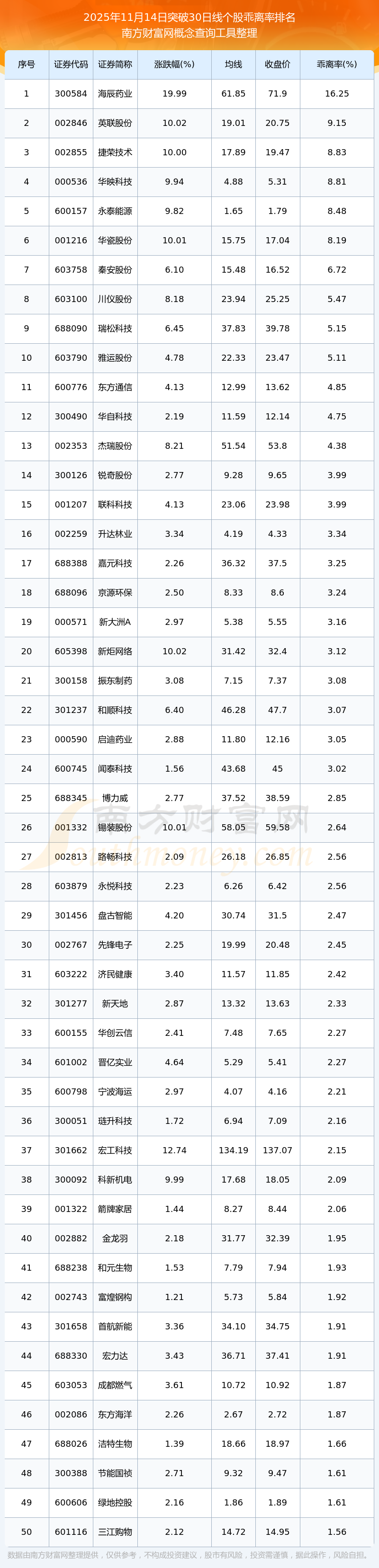 2025年11月14日突破30日线个股乖离率排名