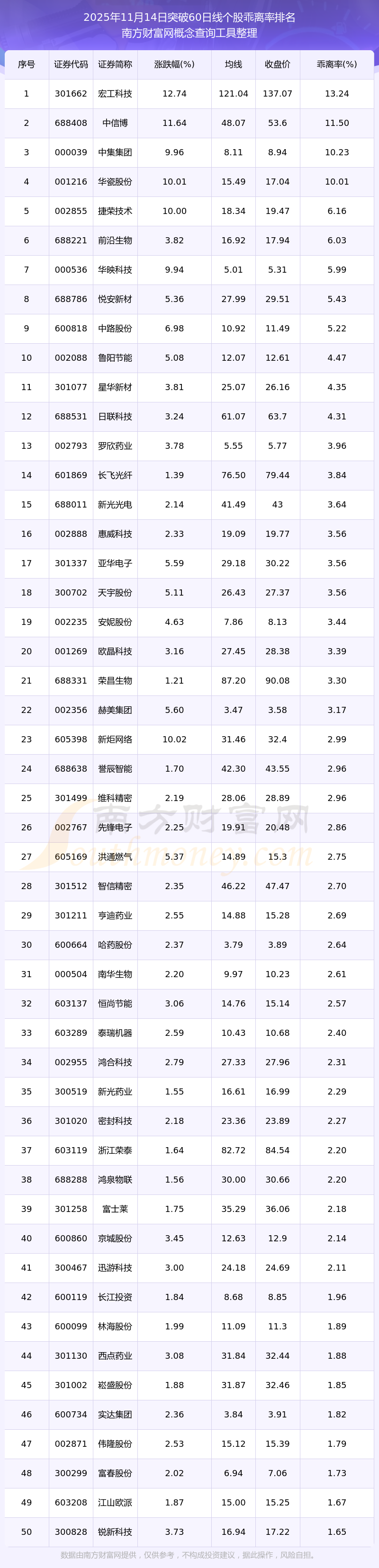 根据开云手机web版登录入口概念查询工具数据统计,截止2025年11月14日收盘,共有108只个股收盘价向上突破了60日线,其中乖离率较大的个股有宏工科技、中信博、中集集团、华瓷股份、捷荣技术等,乖离率分别为13.24%、11.50%、10.23%、10.01%、6.16%。