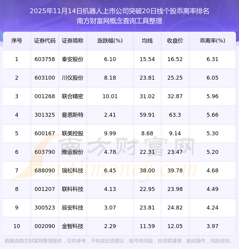 2025年11月14日机器人上市公司突破20日线个股乖离率排名