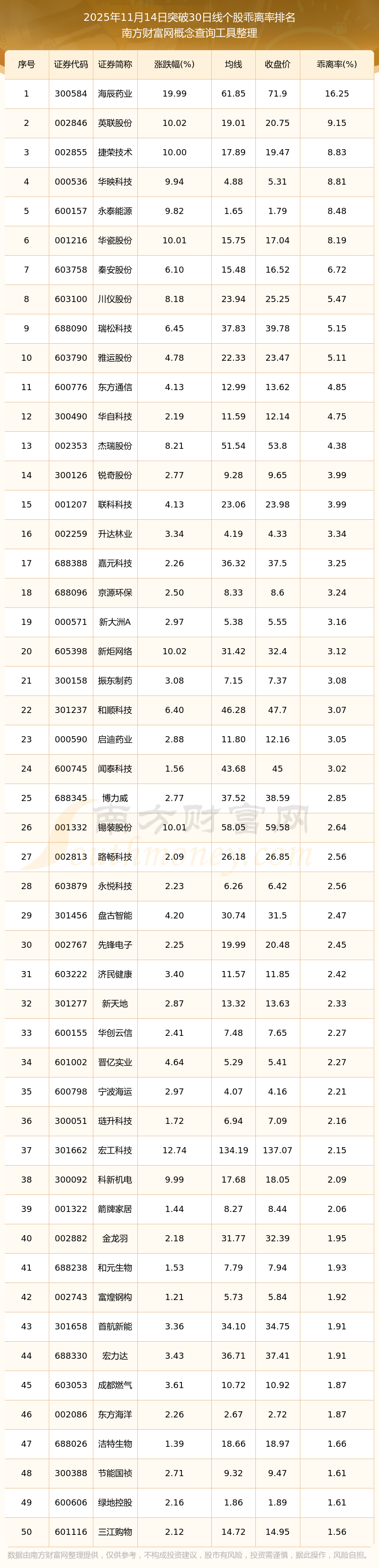 根据开云手机web版登录入口概念查询工具数据统计,截止2025年11月14日收盘,共有103只个股收盘价向上突破了30日线,其中乖离率较大的个股有海辰药业、英联股份、捷荣技术、华映科技、永泰能源等,乖离率分别为16.25%、9.15%、8.83%、8.81%、8.48%。