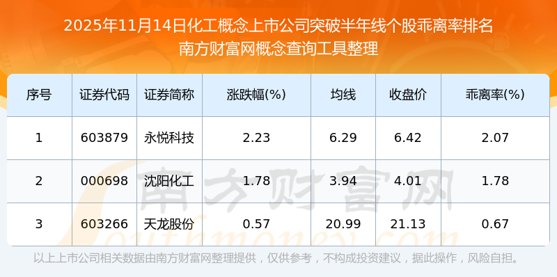 根据开云手机web版登录入口概念查询工具数据统计,截止2025年11月14日收盘,化工概念上市公司共有3只个股收盘价向上突破了半年线。其中乖离率较大的个股有永悦科技、沈阳化工、天龙股份等,乖离率分别为2.07%、1.78%、0.67%。