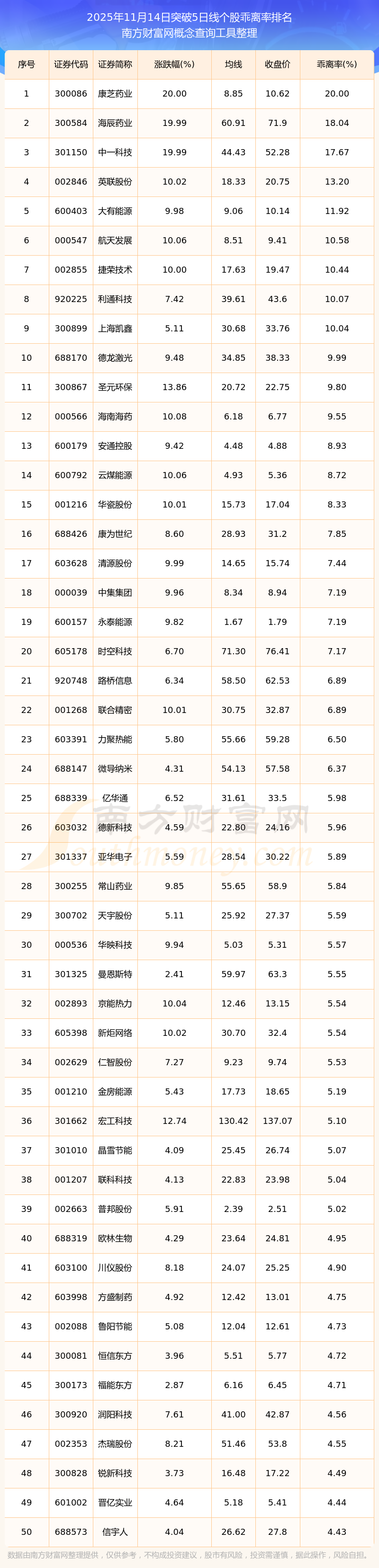 2025年11月14日突破5日线个股乖离率排名