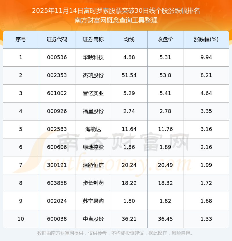 2025年11月14日富时罗素股票突破30日线个股涨跌幅排名
