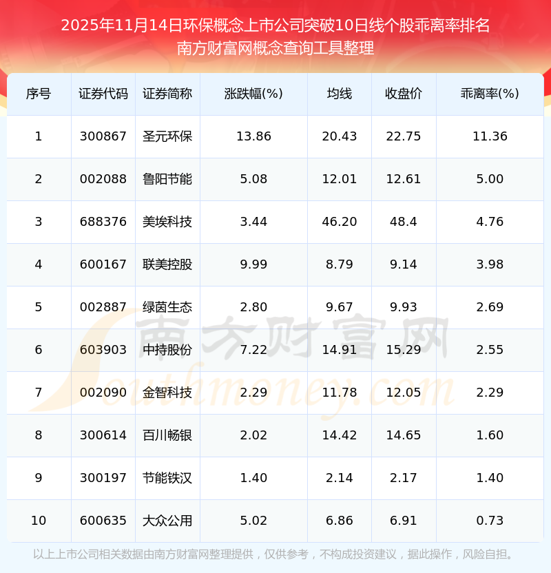 2025年11月14日环保概念上市公司突破10日线个股乖离率排名
