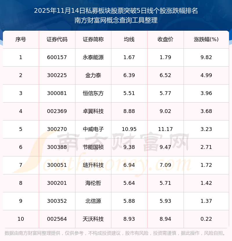 2025年11月14日私募板块股票突破5日线个股涨跌幅排名