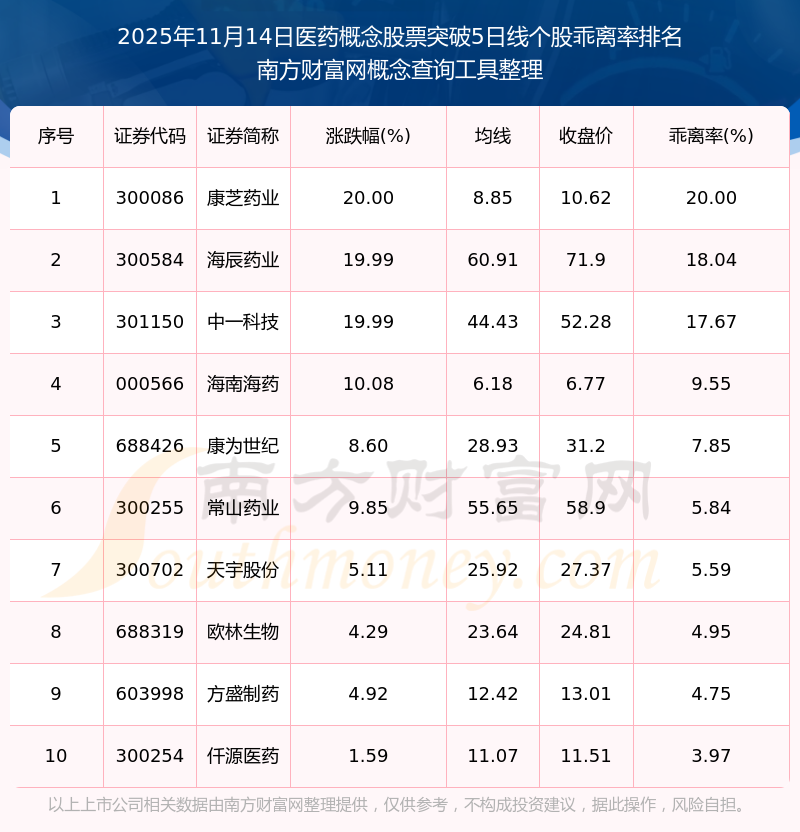 根据开云手机web版登录入口概念查询工具数据统计,截止2025年11月14日收盘,医药概念股票共有34只个股收盘价向上突破了5日线。其中乖离率较大的个股有康芝药业、海辰药业、中一科技等,乖离率分别为20.00%、18.04%、17.67%。