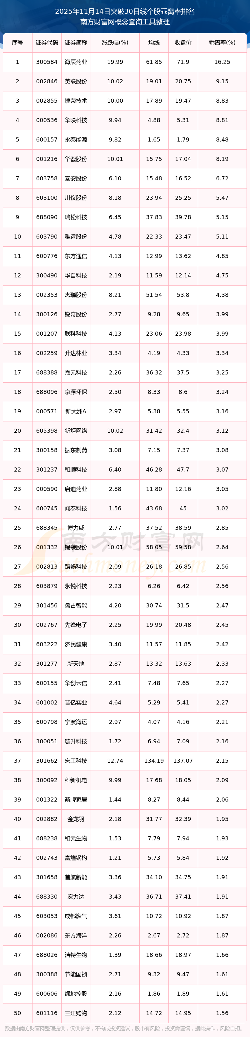 2025年11月14日突破30日线个股乖离率排名