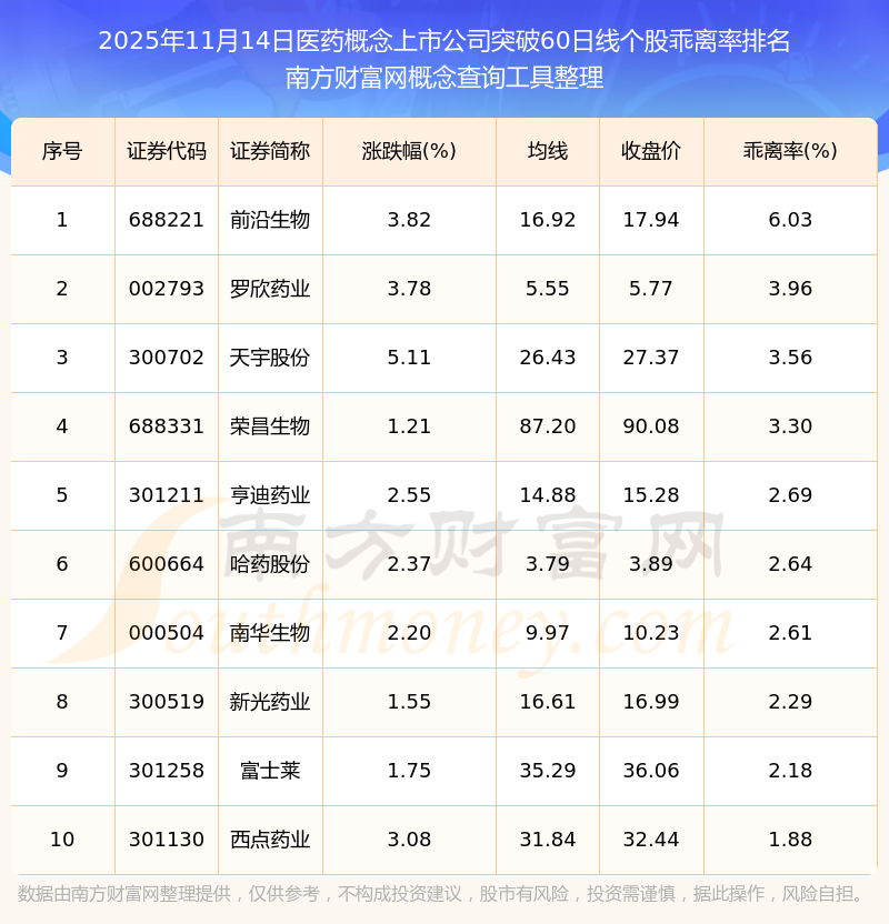 2025年11月14日医药概念上市公司突破60日线个股乖离率排名