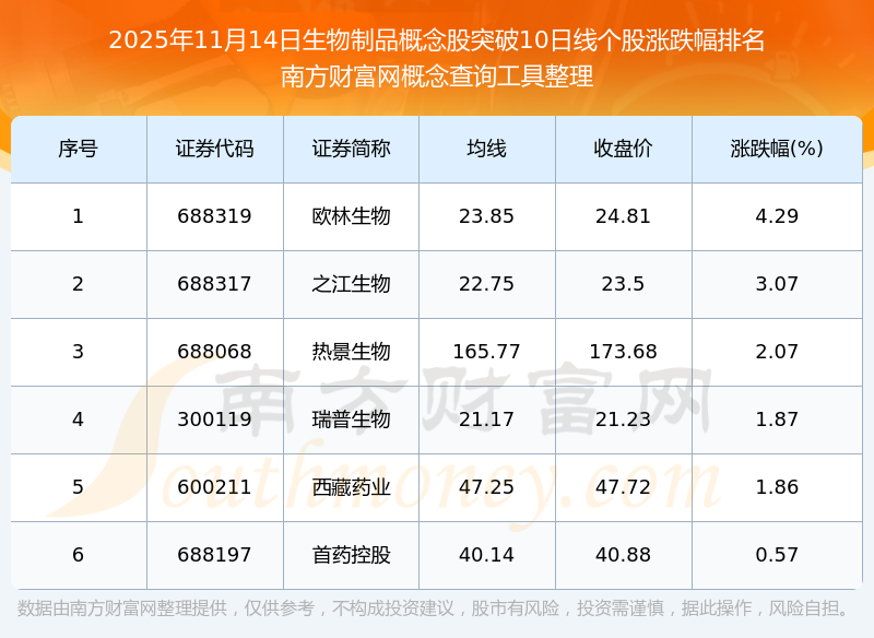 2025年11月14日生物制品概念股突破10日线个股涨跌幅排名