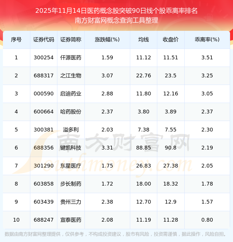2025年11月14日医药概念股突破90日线个股乖离率排名