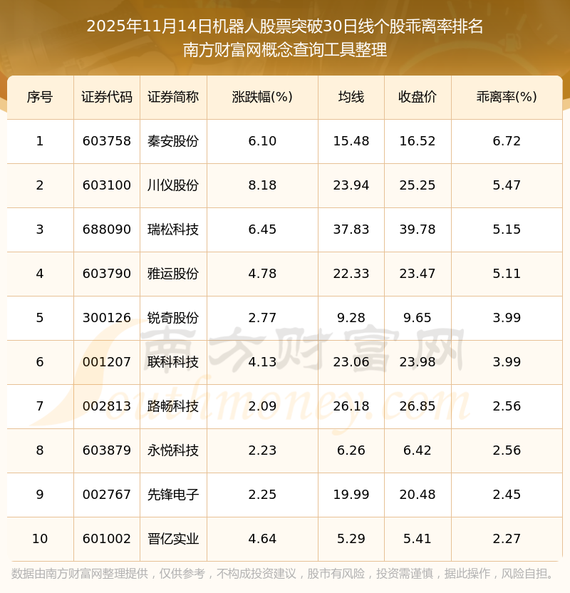 根据开云手机web版登录入口概念查询工具数据统计,截止2025年11月14日收盘,机器人股票共有15只个股收盘价向上突破了30日线。其中乖离率较大的个股有秦安股份、川仪股份、瑞松科技等,乖离率分别为6.72%、5.47%、5.15%。