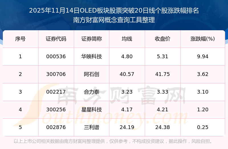 2025年11月14日OLED板块股票突破20日线个股涨跌幅排名