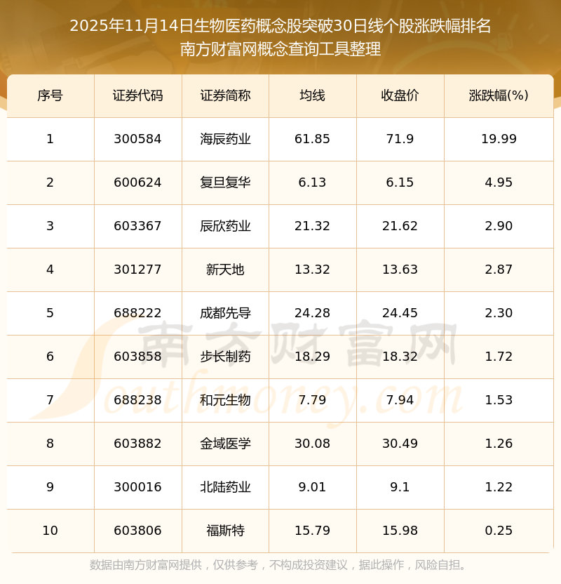 根据开云手机web版登录入口概念查询工具数据统计,截止2025年11月14日收盘,生物医药概念股共有10只个股收盘价向上突破了30日线。其中涨幅较大的个股有海辰药业、复旦复华、辰欣药业等,涨幅分别为19.99%、4.95%、2.90%。
