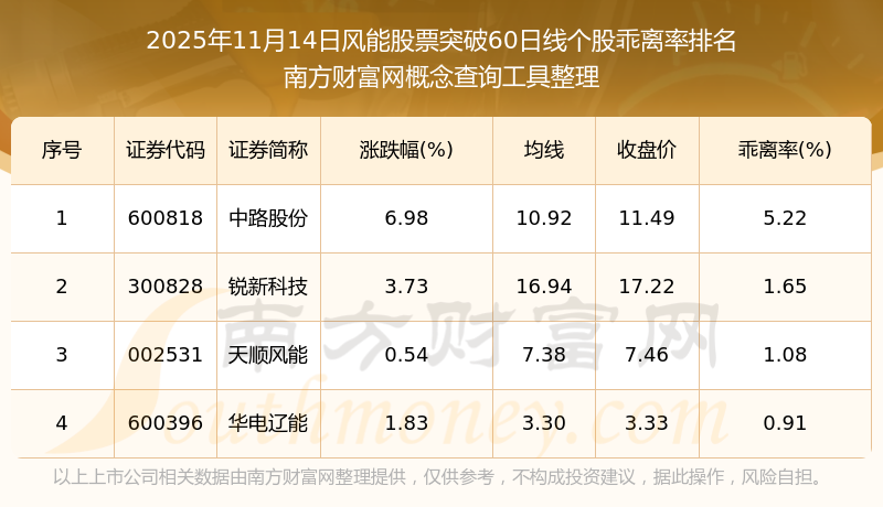 2025年11月14日风能股票突破60日线个股乖离率排名