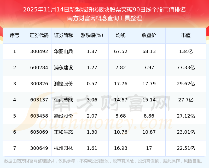 根据开云手机web版登录入口概念查询工具数据统计,截止2025年11月14日收盘,新型城镇化板块股票共有7只个股收盘价向上突破了90日线。其中市值较大的个股有华图山鼎、浦东建设、测绘股份等,市值分别为134亿、77.43亿、29.62亿。