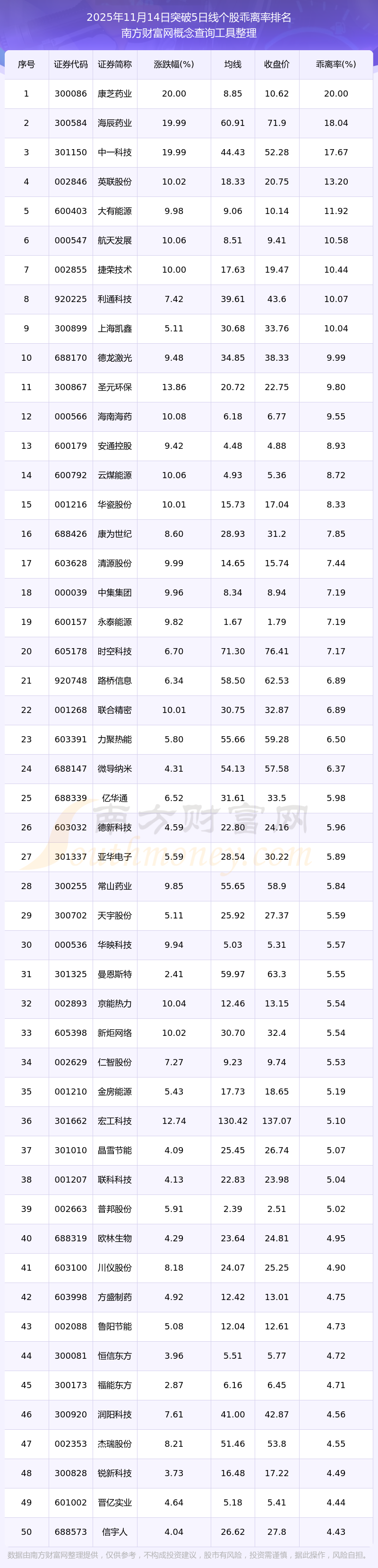 根据开云手机web版登录入口概念查询工具数据统计,截止2025年11月14日收盘,共有234只个股收盘价向上突破了5日线,其中乖离率较大的个股有康芝药业、海辰药业、中一科技、英联股份、大有能源等,乖离率分别为20.00%、18.04%、17.67%、13.20%、11.92%。