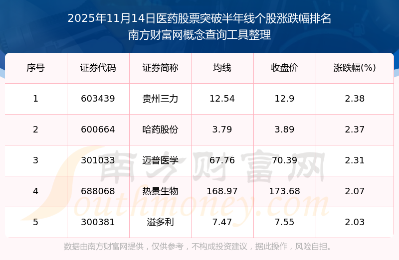 2025年11月14日医药股票突破半年线个股涨跌幅排名