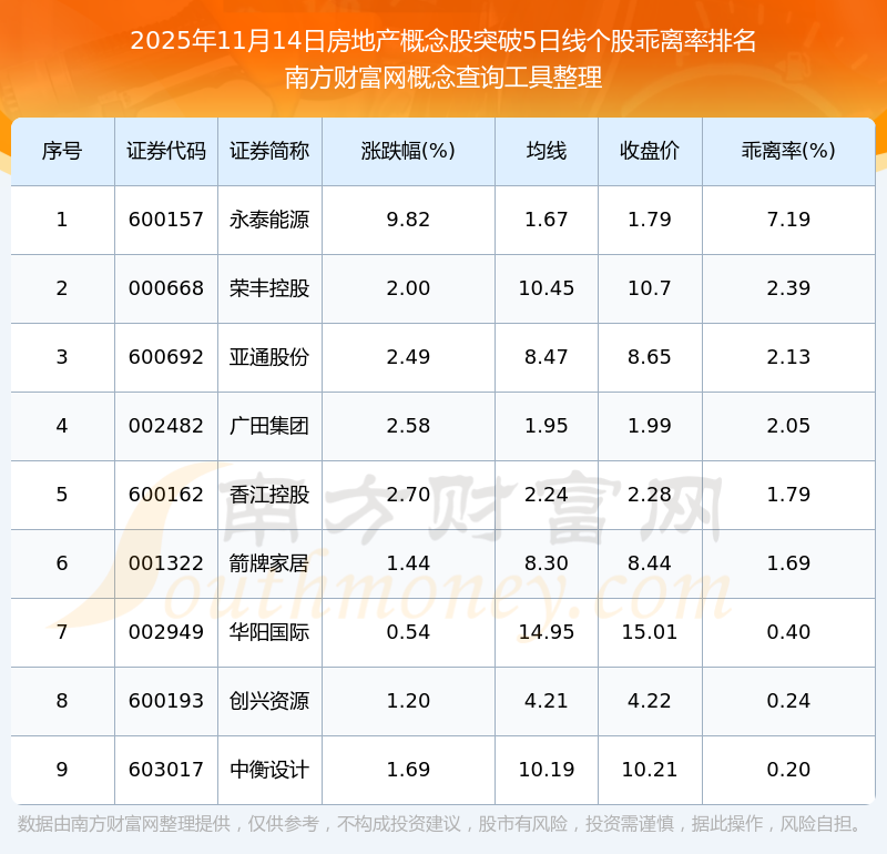 根据开云手机web版登录入口概念查询工具数据统计,截止2025年11月14日收盘,房地产概念股共有9只个股收盘价向上突破了5日线。其中乖离率较大的个股有永泰能源、荣丰控股、亚通股份等,乖离率分别为7.19%、2.39%、2.13%。